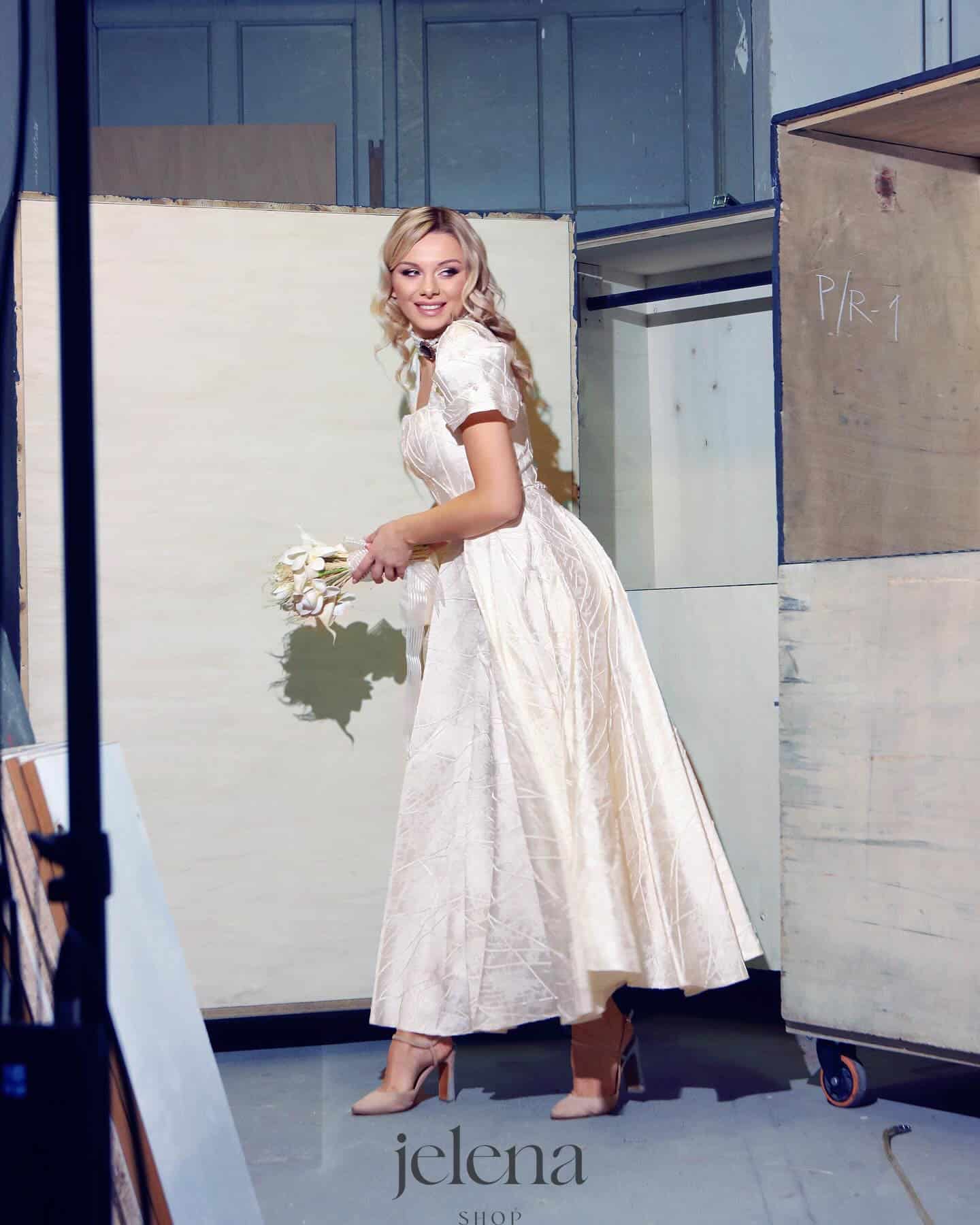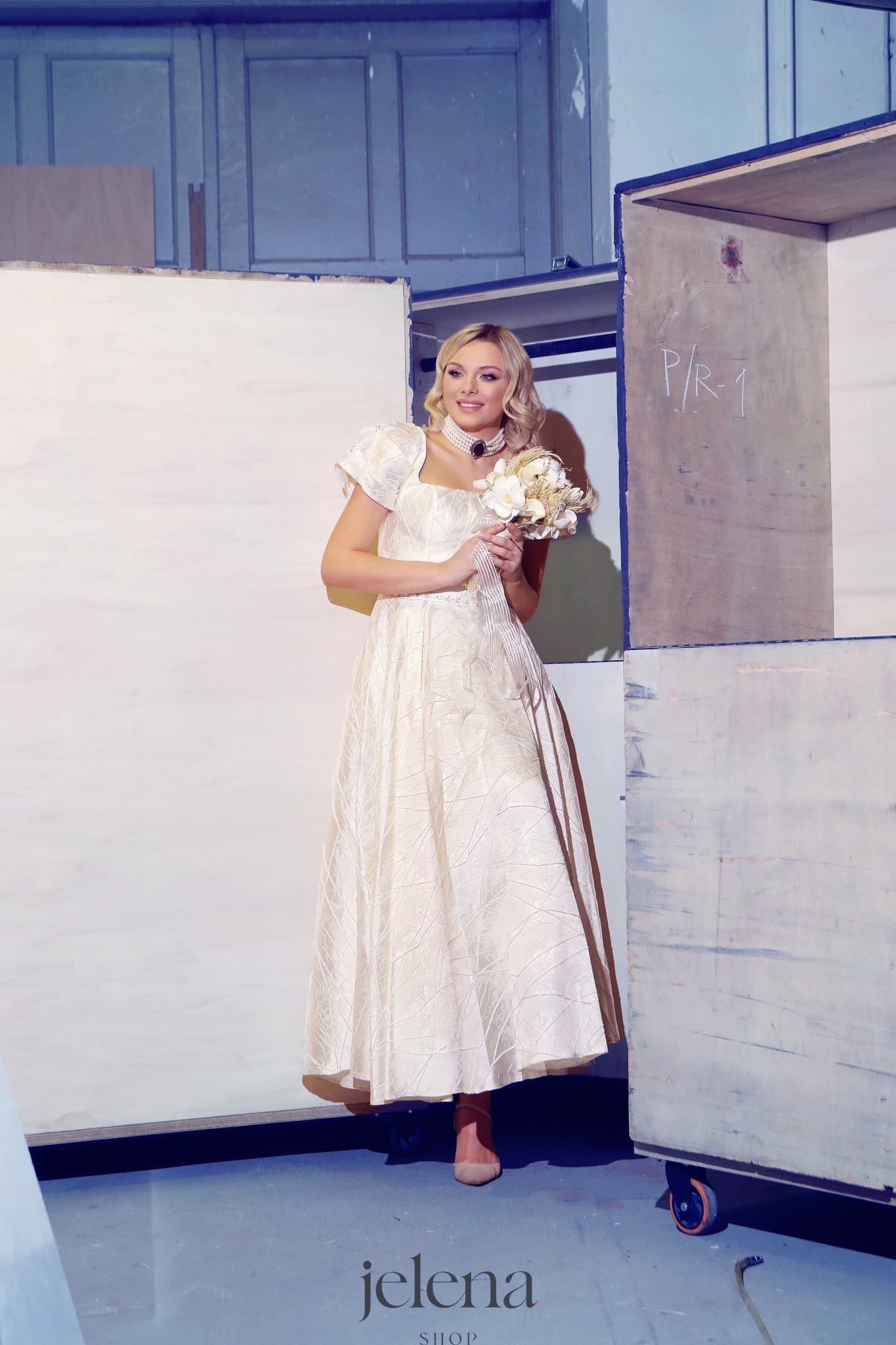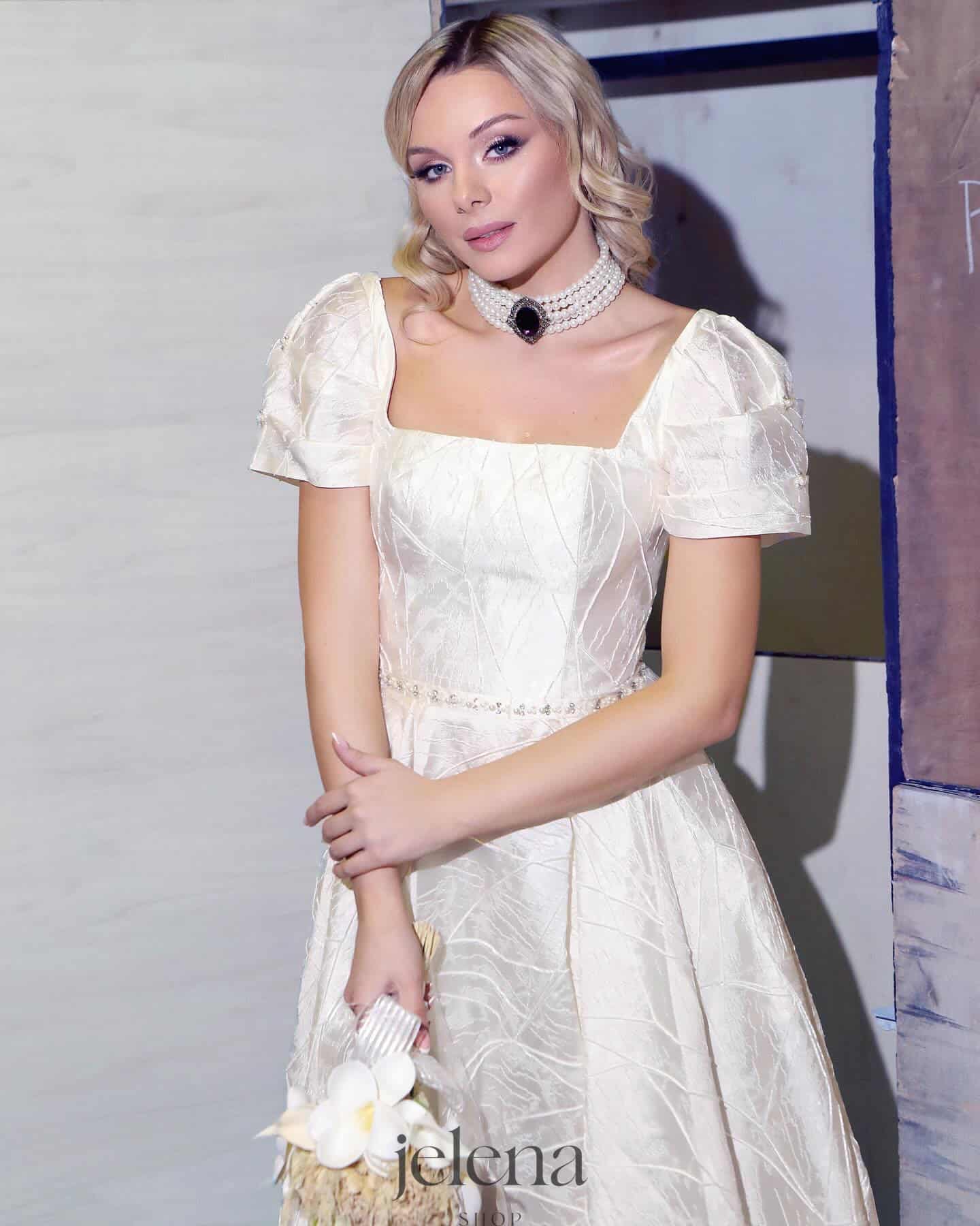 Elegantna haljina u nježnoj krem boji, idealna za vjenčanja, maturske večeri i svečane prilike poput upisa. Izrađena od materijala sa suptilnom teksturom koja daje dubinu i luksuzan izgled, dodatno obogaćena diskretnim biserima koji unose dozu sofisticiranog sjaja. Lepršav kroj sa blagim volumenom pruža ženstvenu siluetu i udobnost pri nošenju.