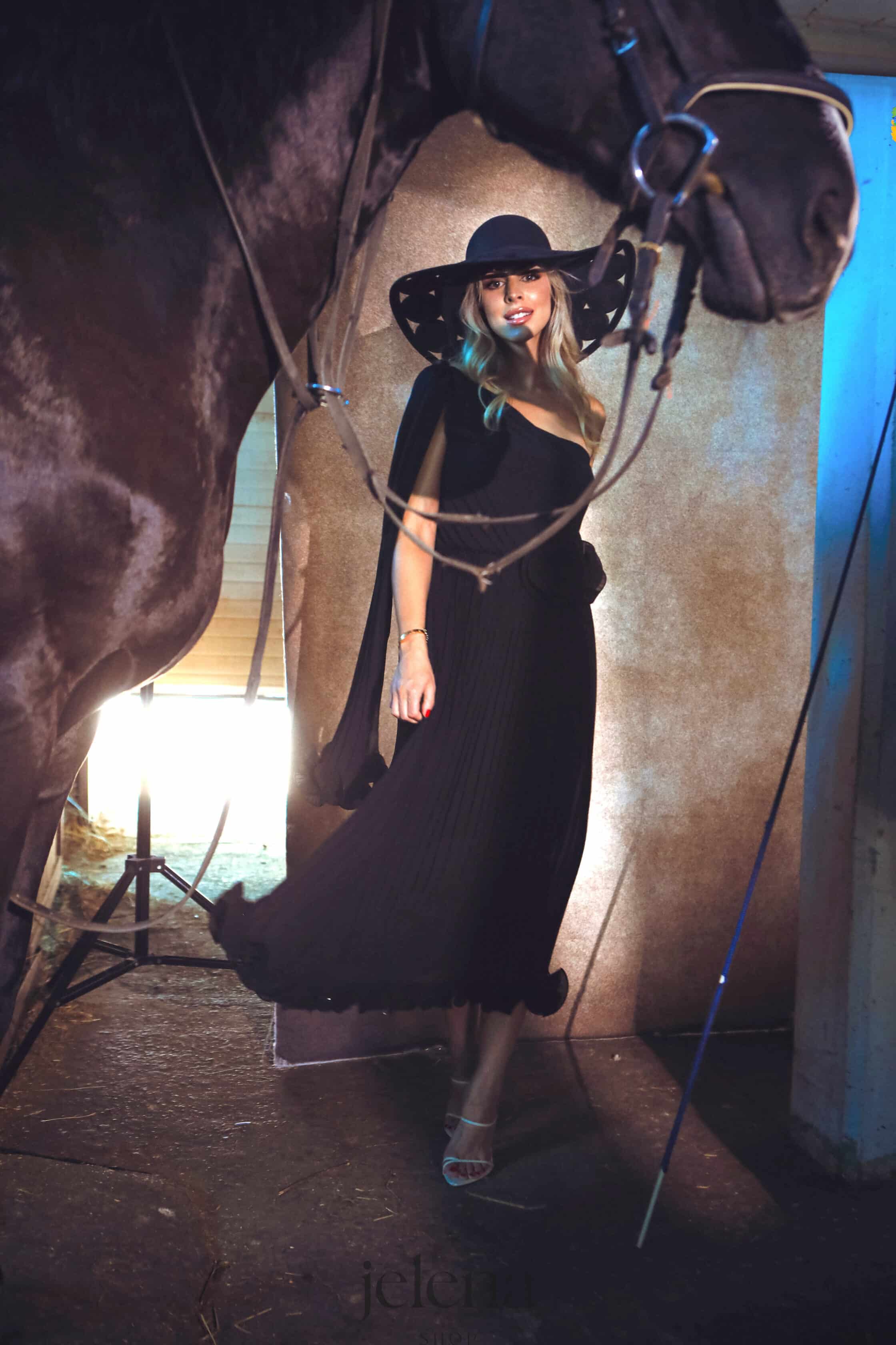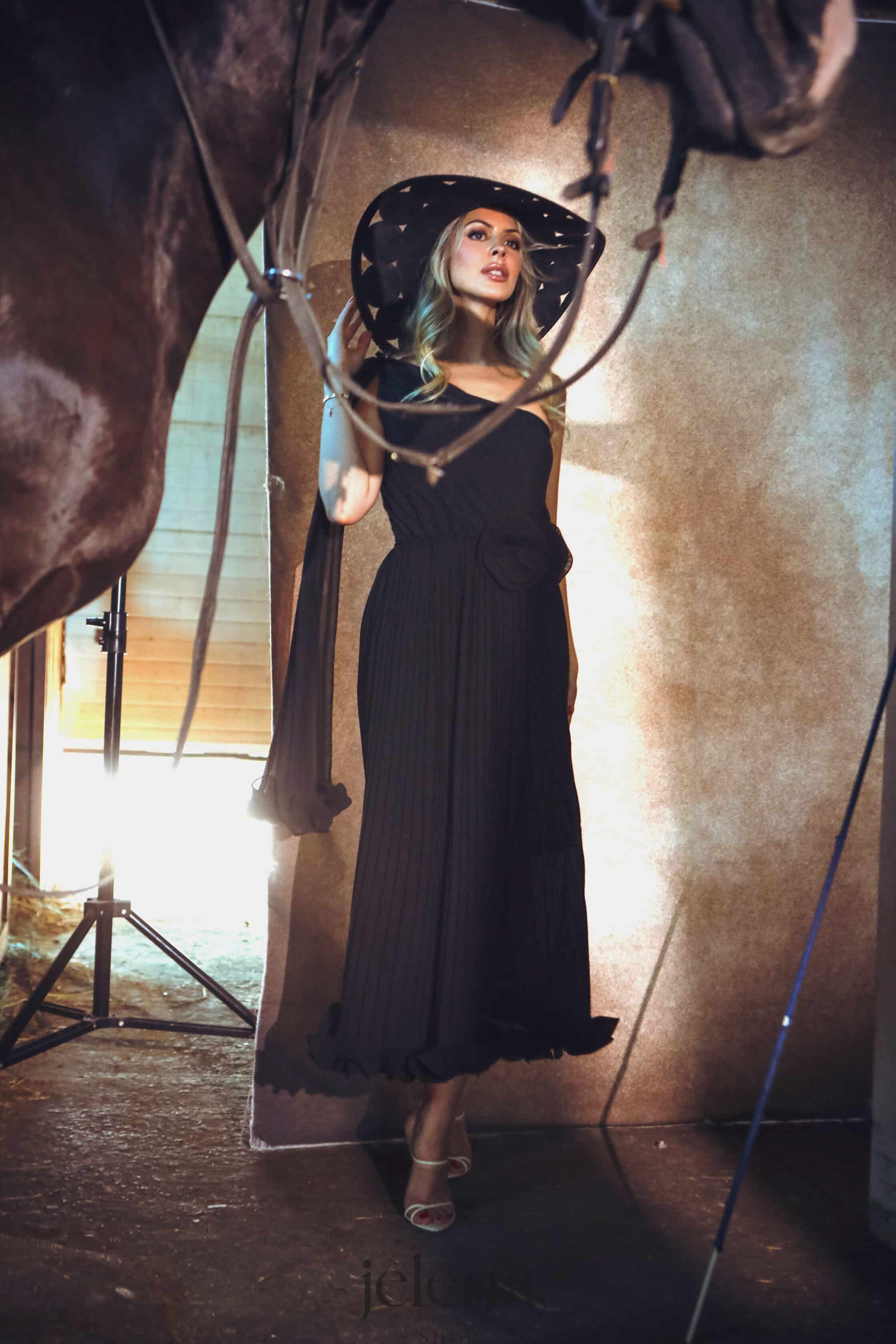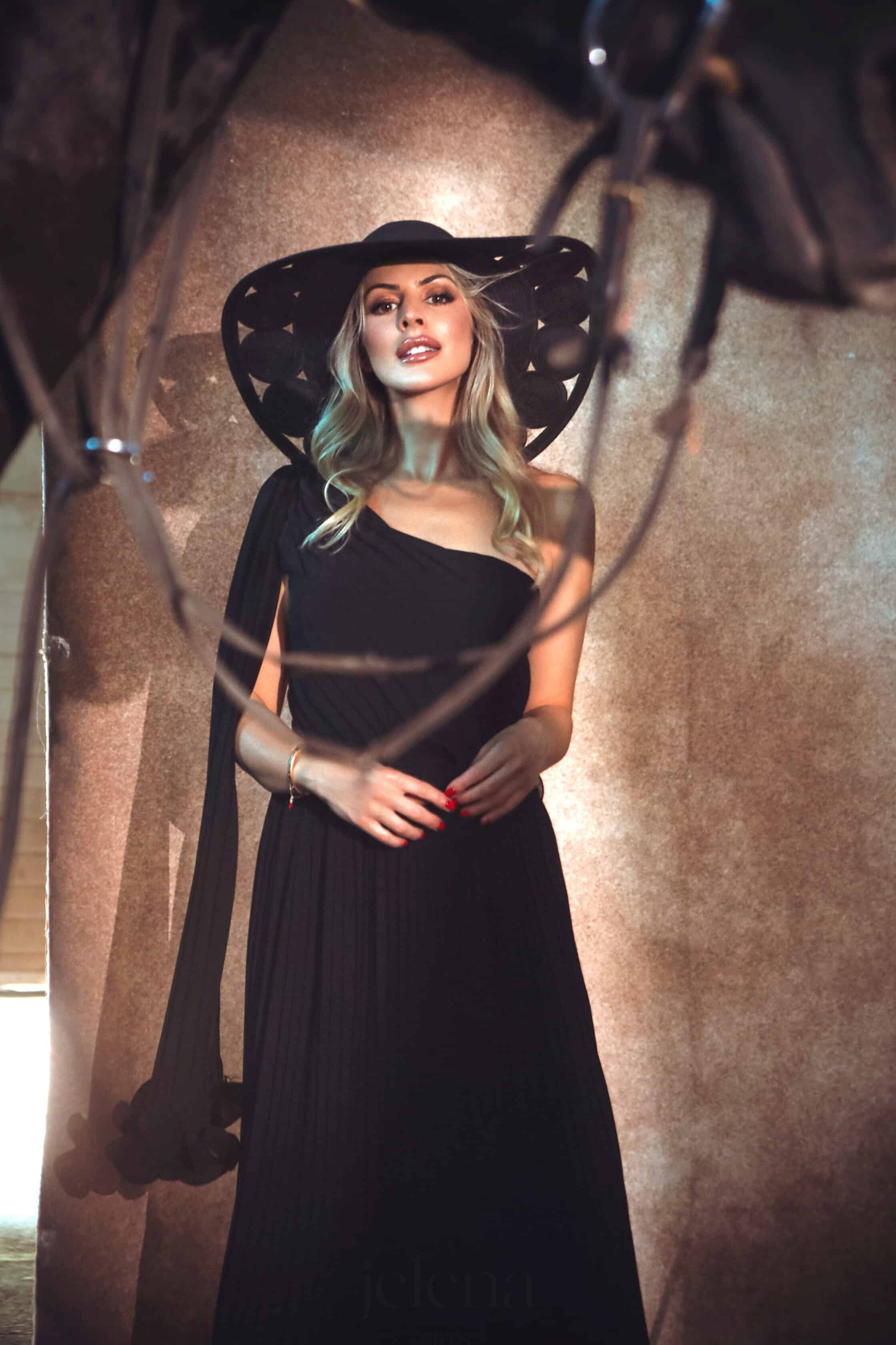 Elegantna crna haljina midi dužine sa profinjenim plisiranim donjim dijelom koji daje lagan i ženstven pad. Gornji dio je jednostavan i sofisticiran, dok se u struku ističe dekorativni detalj u obliku cvijeta koji dodatno naglašava siluetu. Poseban šarm daje lagani, lepršavi šal koji se spušta niz rame, stvarajući efektan i romantičan izgled