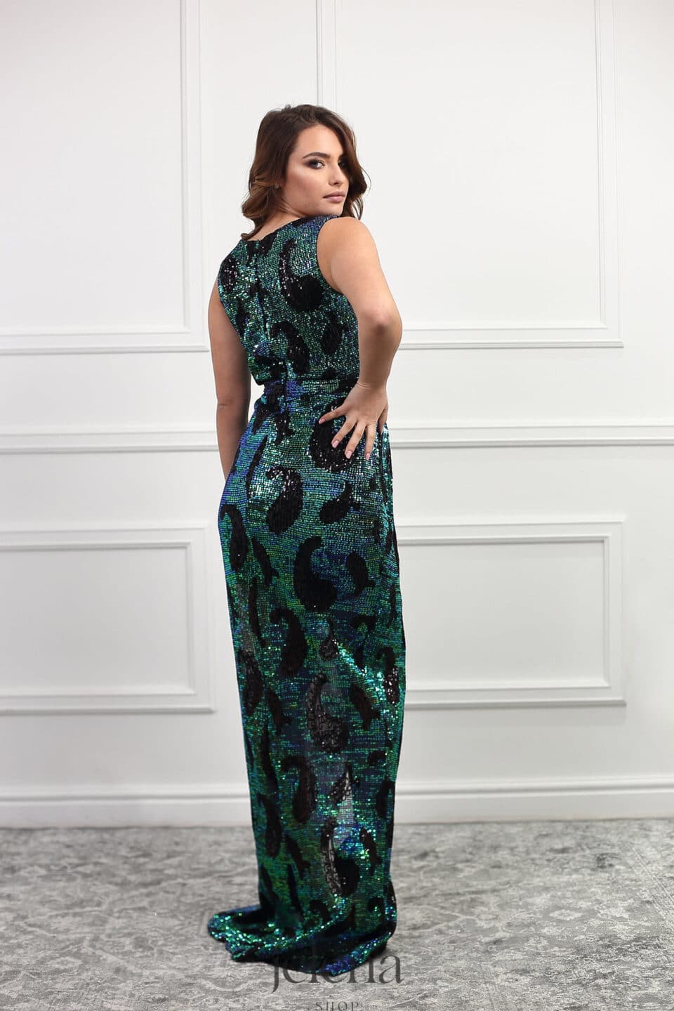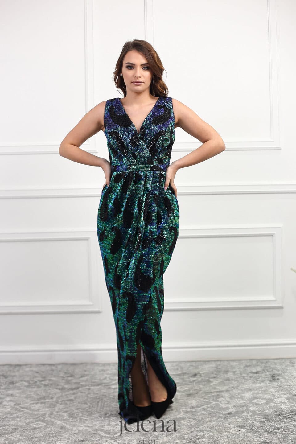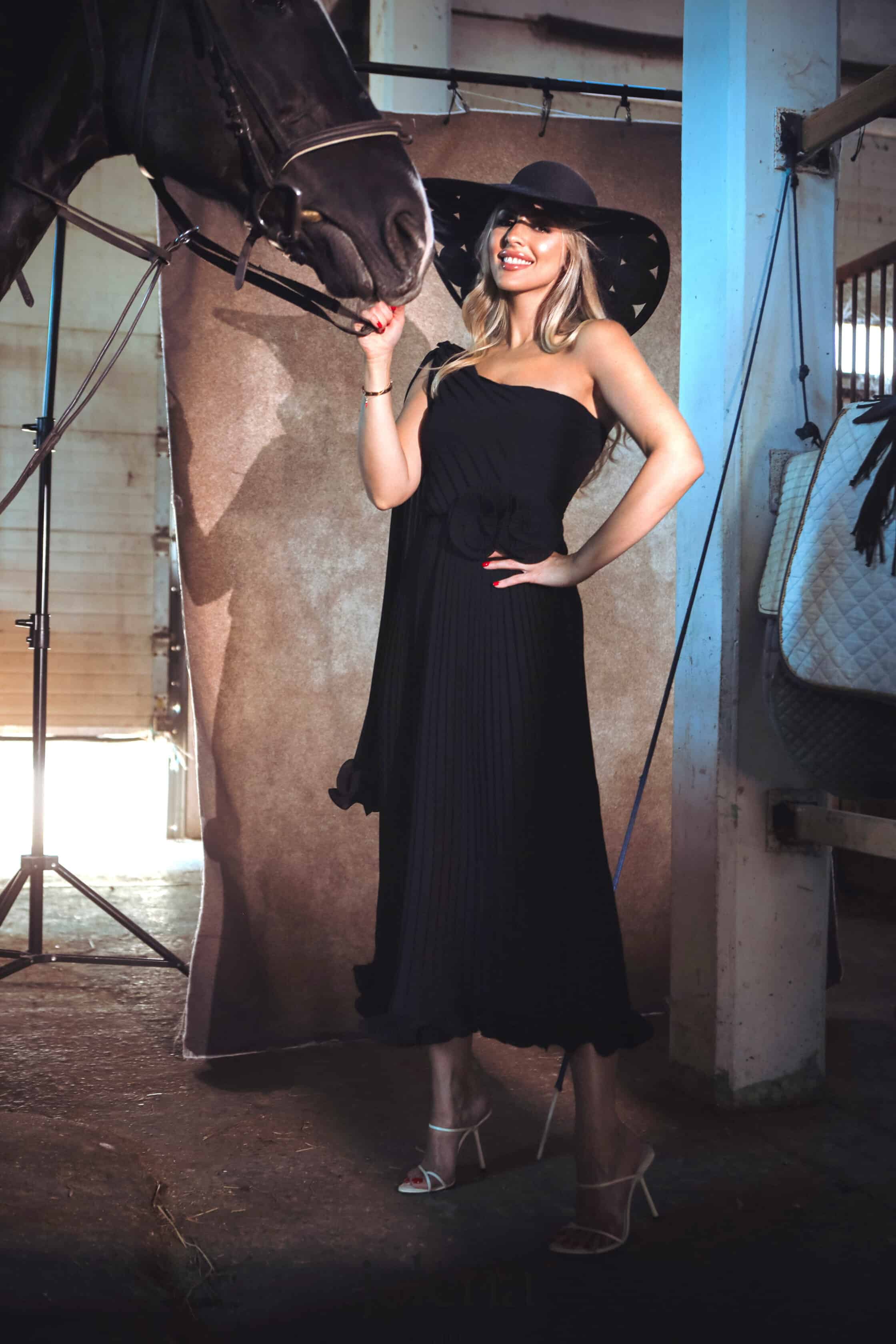 Elegantna crna haljina midi dužine sa profinjenim plisiranim donjim dijelom koji daje lagan i ženstven pad. Gornji dio je jednostavan i sofisticiran, dok se u struku ističe dekorativni detalj u obliku cvijeta koji dodatno naglašava siluetu. Poseban šarm daje lagani, lepršavi šal koji se spušta niz rame, stvarajući efektan i romantičan izgled