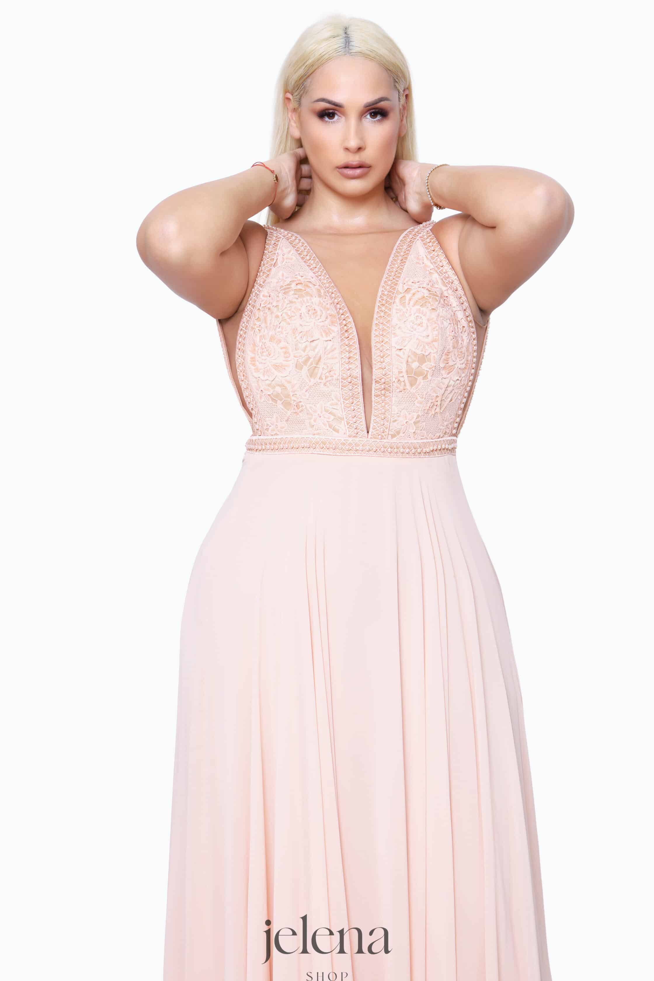 Elegantna večernja haljina u nježnoj puderasto-rozoj nijansi, izrađena od laganog, lepršavog materijala koji graciozno prati liniju tijela. Gornji dio ukrašen je finom čipkom i dubokim V izrezom sa prozirnim detaljem, dok naglašeni struk vizuelno izdužuje figuru. Idealna za maturske večeri, svečane događaje i posebne prilike kada želite sofisticiran i ženstven izgled.