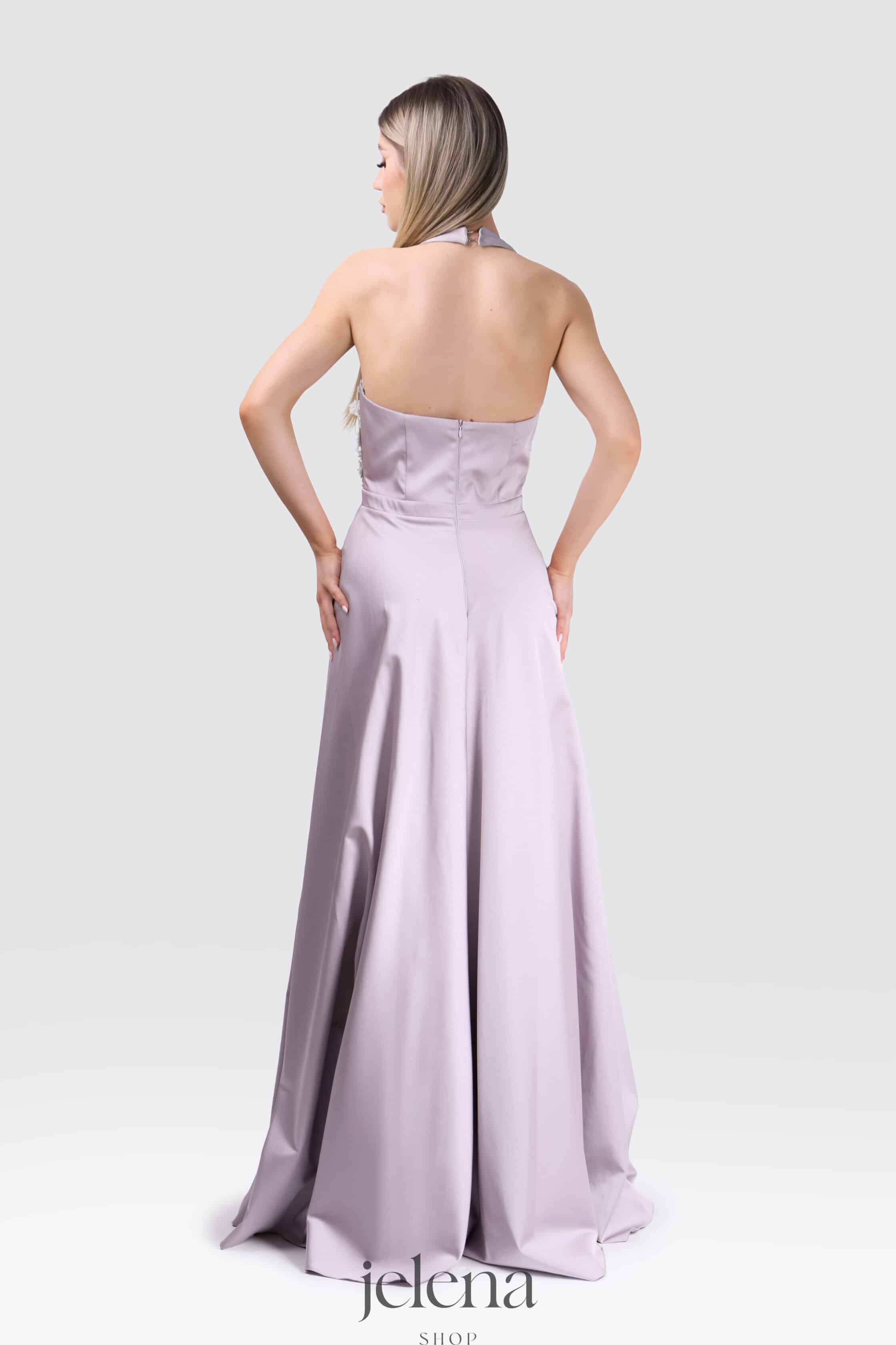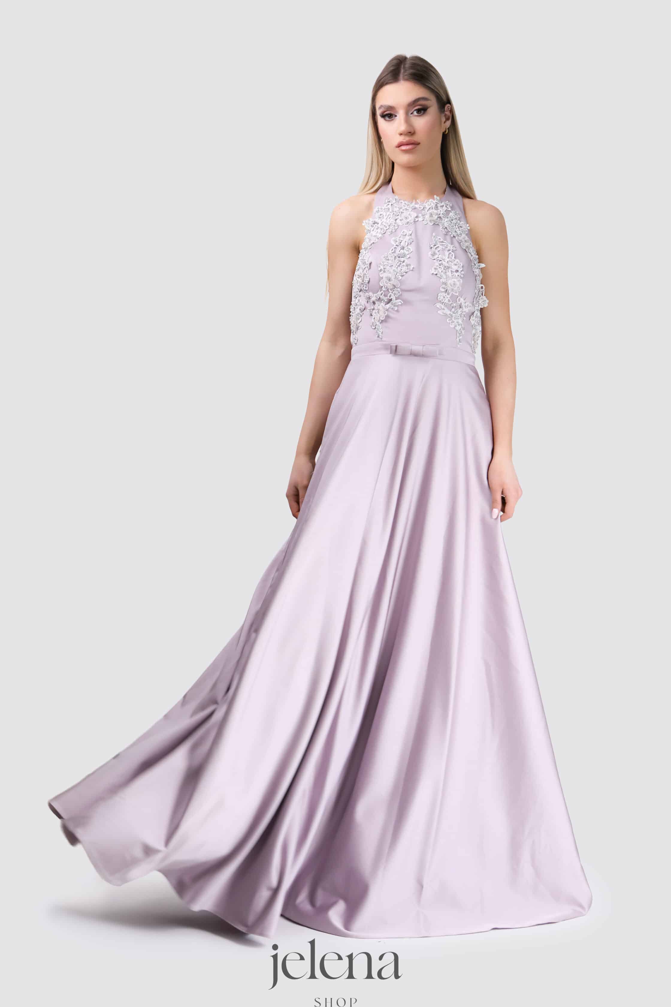 Elegantna duga haljina u nježnoj lila nijansi koja odiše romantikom i profinjenošću. Gornji dio sa visokim izrezom ukrašen je delikatnim čipkastim aplikacijama koje naglašavaju dekolte i daju haljini sofisticiran izgled. Lagano padajuća suknja A-kroja prati liniju tijela i pruža udobnost i eleganciju pri svakom pokretu, čineći ovu haljinu savršenim izborom za maturu i druge svečane prilike.