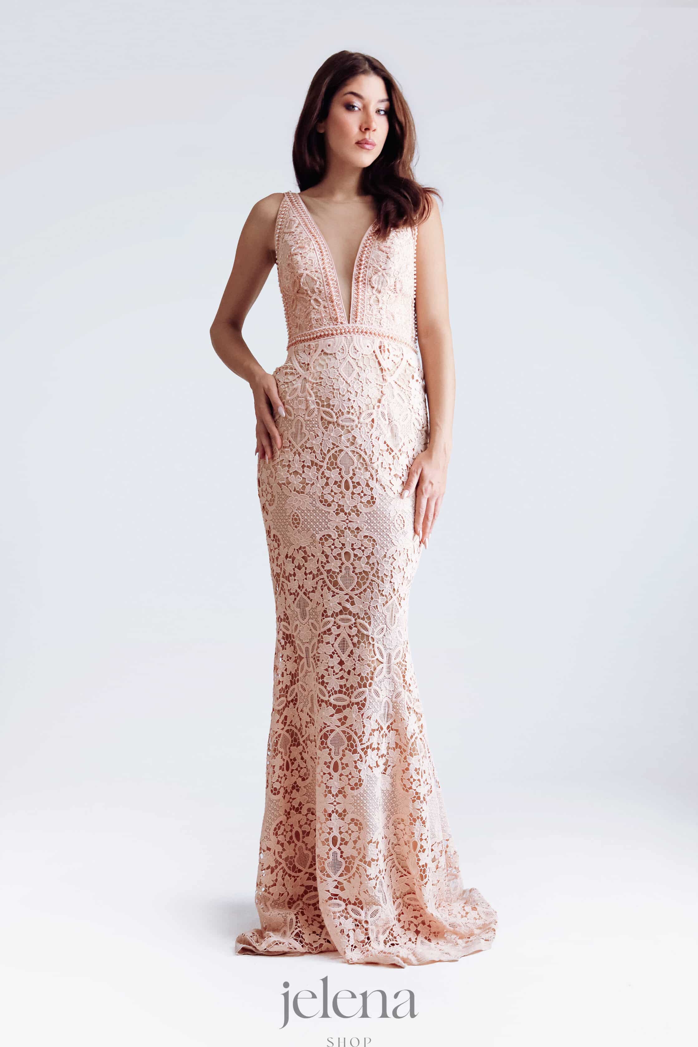 Elegantna duga haljina izrađena od raskošne čipke u nježnoj puder nijansi.