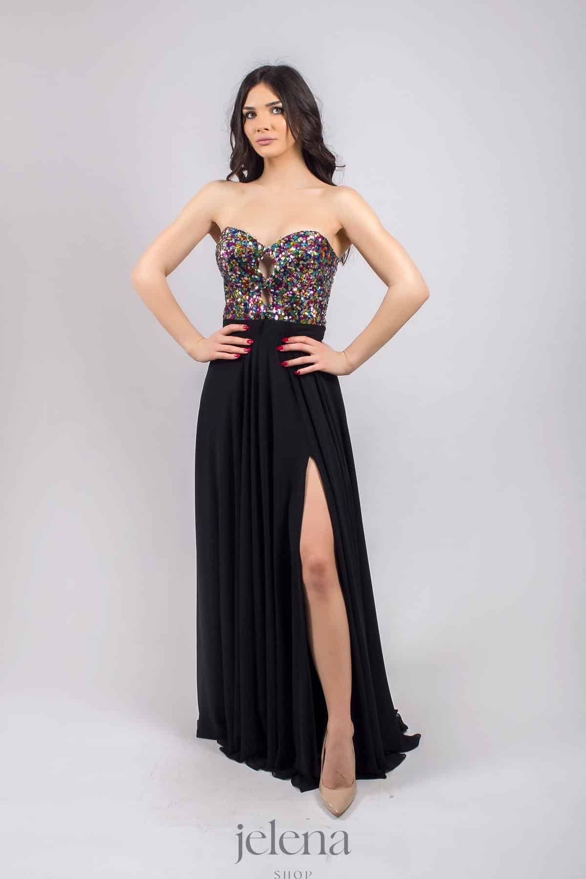 Elegantna svečana haljina sa gornjim dijelom u formi korzeta ukrašen bogatim, višebojnim šljokicama koje reflektuju svjetlost i naglašavaju ženstvenost, dok duboki srcoliki izrez dodatno ističe dekolte i daje sofisticiran izgled.