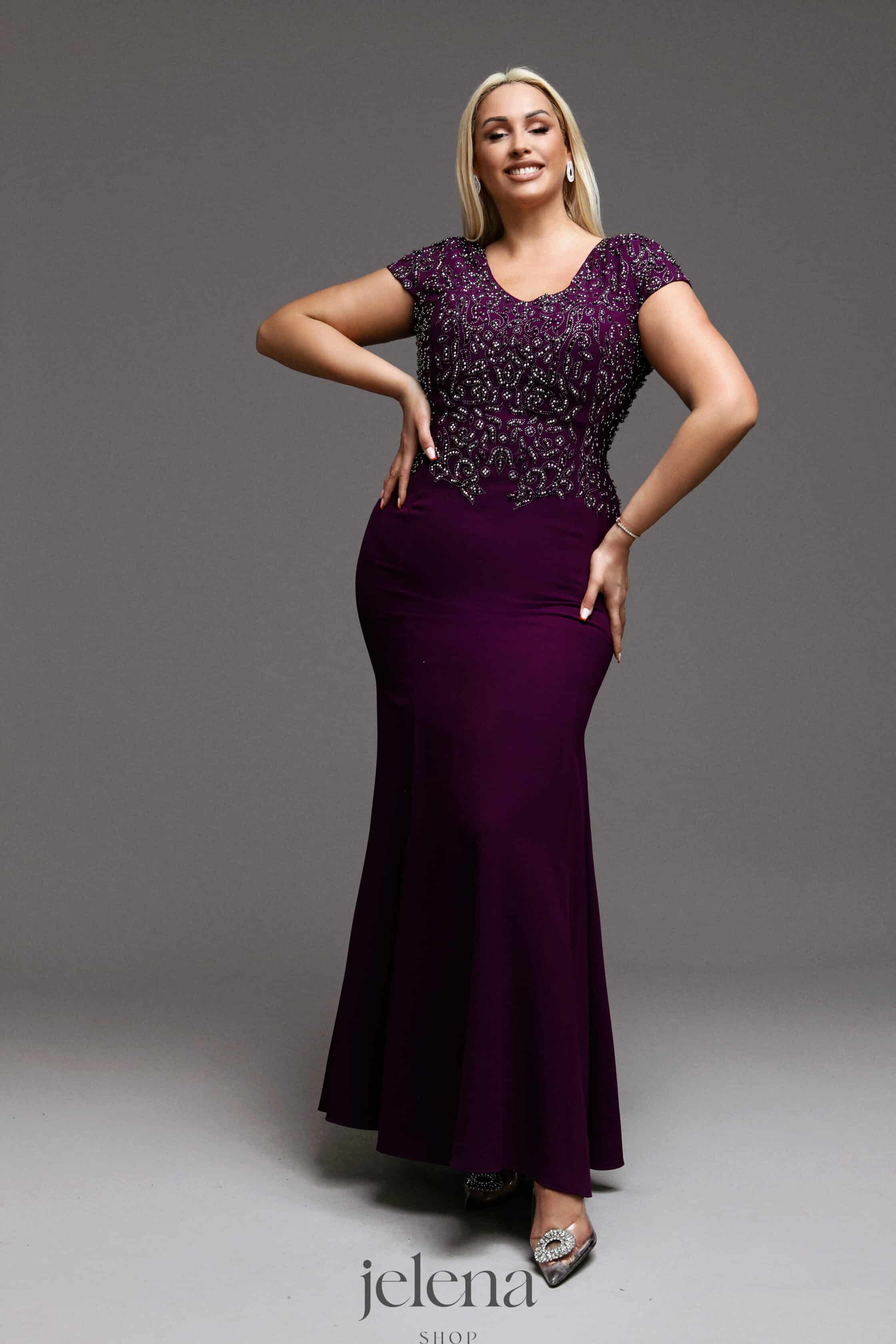 Duga svečana haljina sirena kroja koja elegantno prati liniju tijela i ističe siluetu. Gornji dio je bogato ukrašen perlicama i dekorativnim detaljima, dok lepršava suknja daje dozu profinjenosti i ženstvenosti. Idealan izbor za svečane događaje, vjenčanja i posebne prilike.
