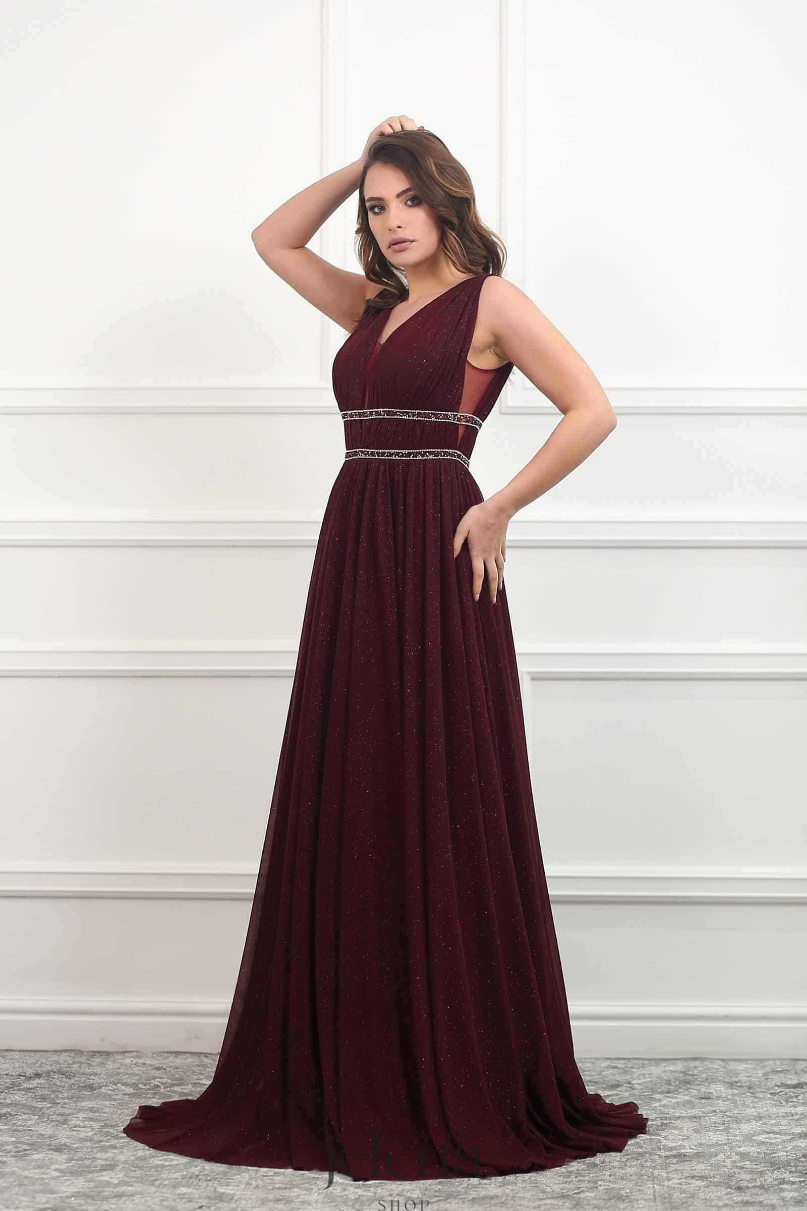 Duga svečana haljina u bordo nijansi sa diskretnim sjajem. Elegantni V-izrez i naglašeni struk sa dekorativnim pojasom ističu siluetu, dok lagano lepršavi kroj daje sofisticiran i ženstven izgled. Savršen izbor za maturu, svadbu i svečane večernje prilike.
