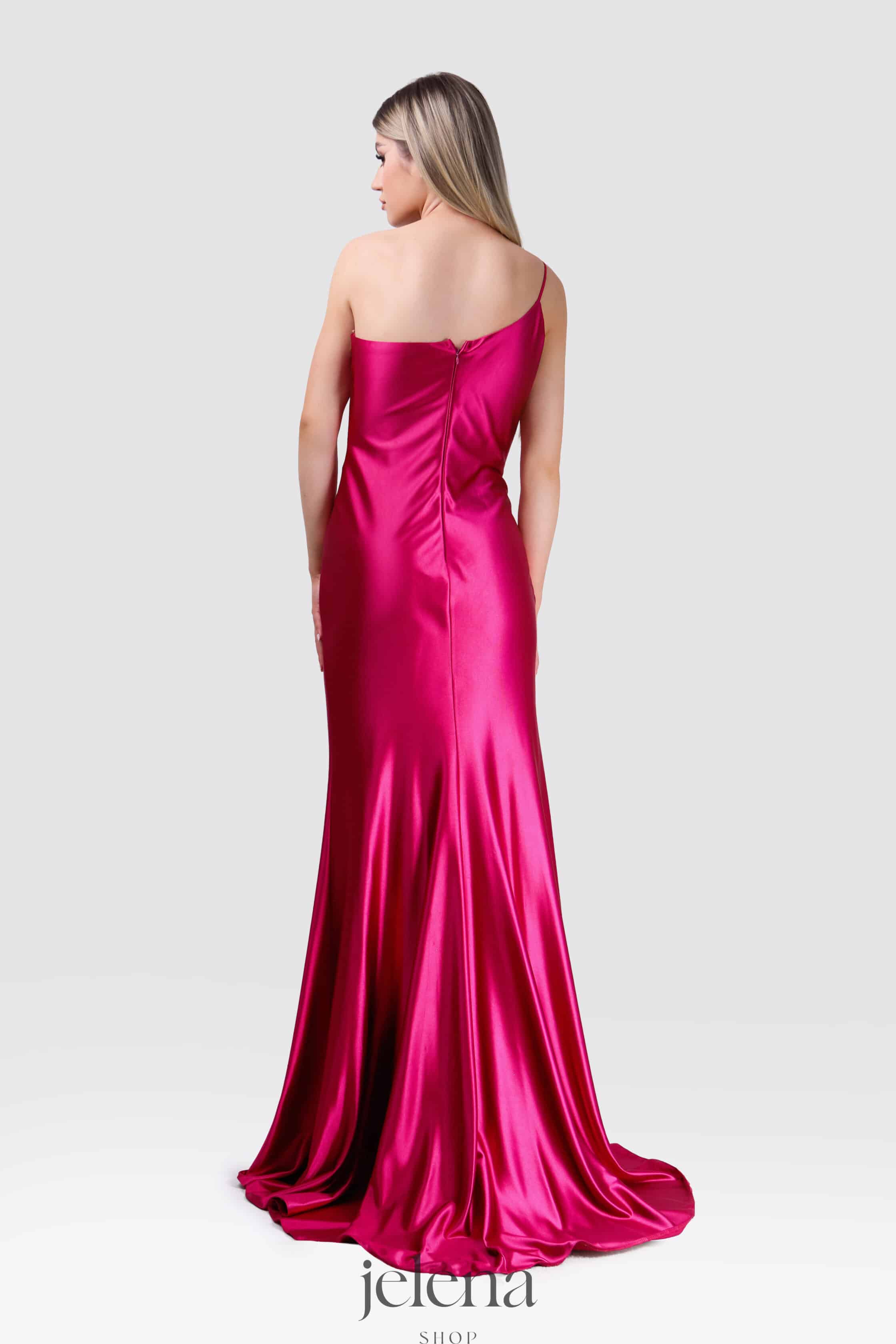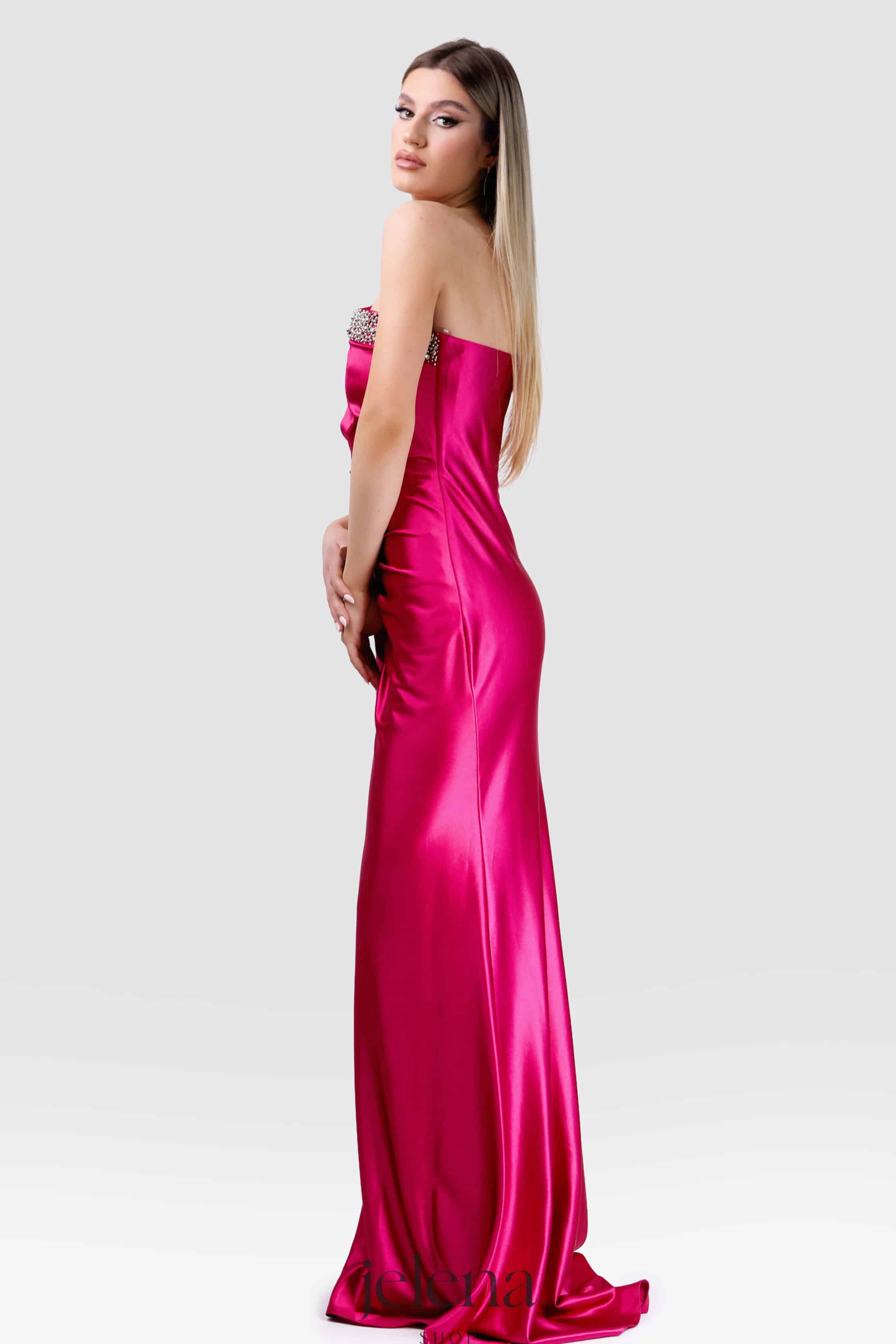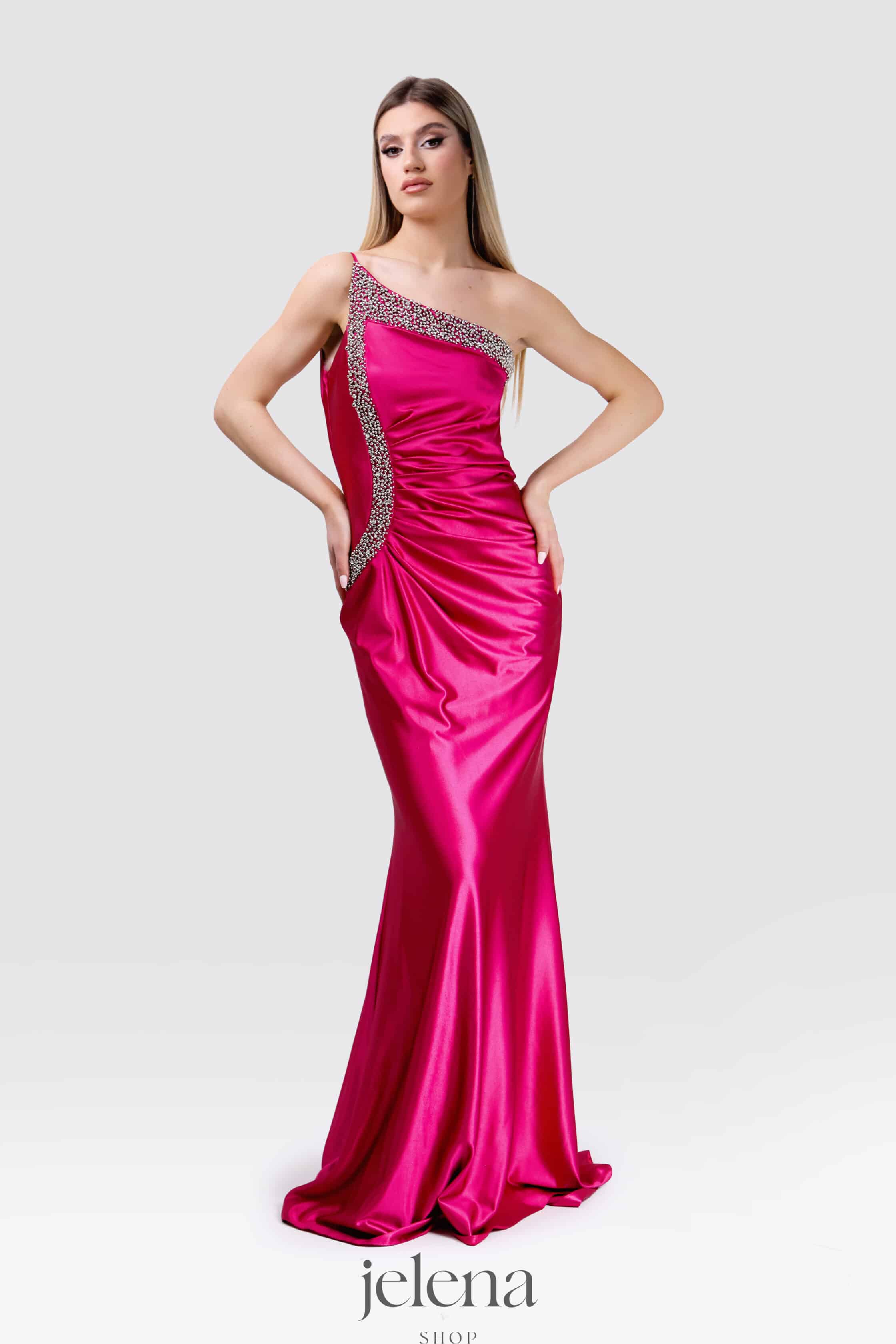 Elegantna duga haljina u upečatljivoj fuksija boji koja naglašava ženstvenu siluetu. Asimetrični kroj na jedno rame ukrašen je svjetlucavim kristalima koji prate liniju haljine i ističu struk. Glatki, sjajni materijal i uski kroj koji prati liniju tijela daju sofisticiran i glamurozan izgled.