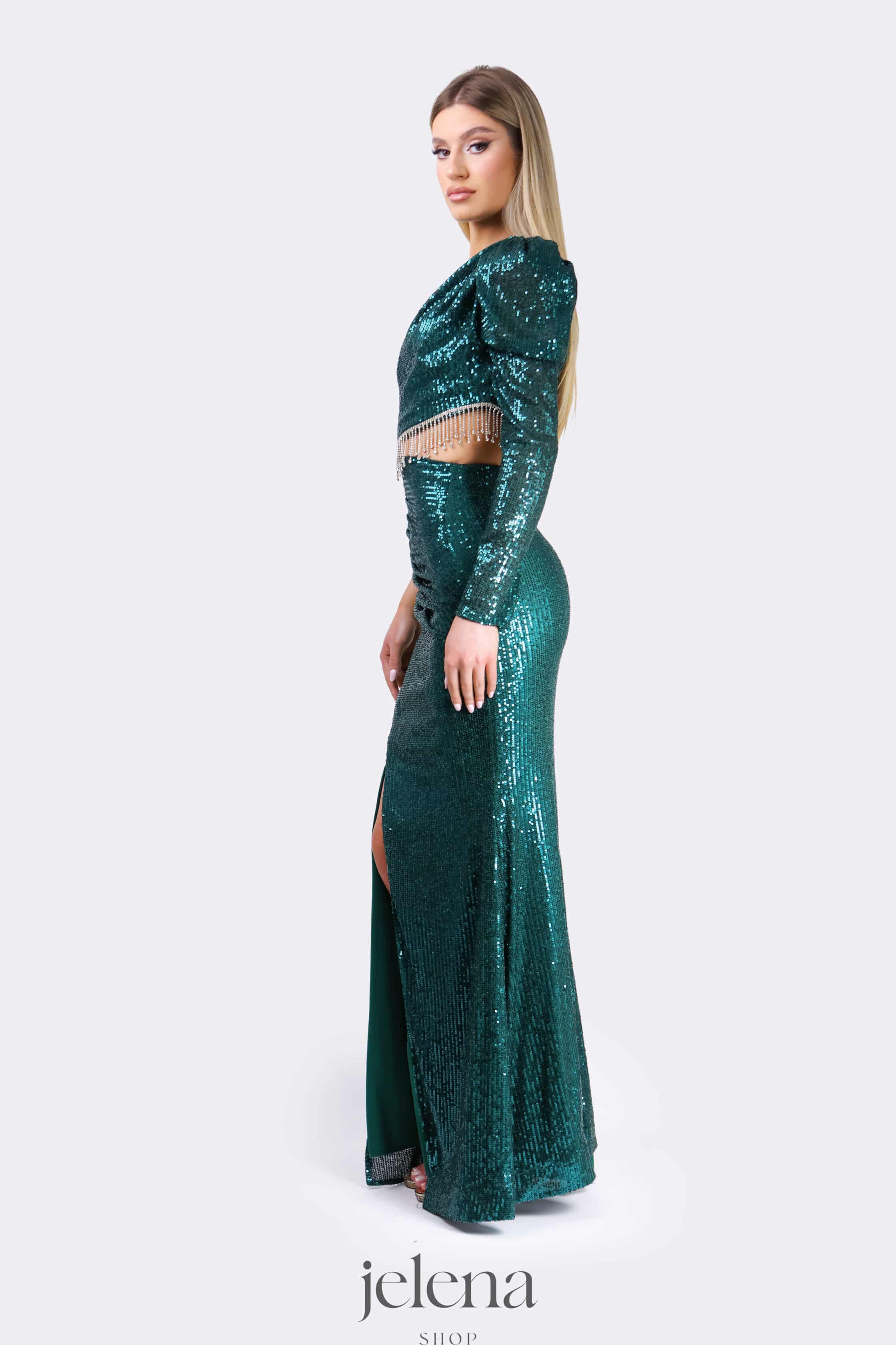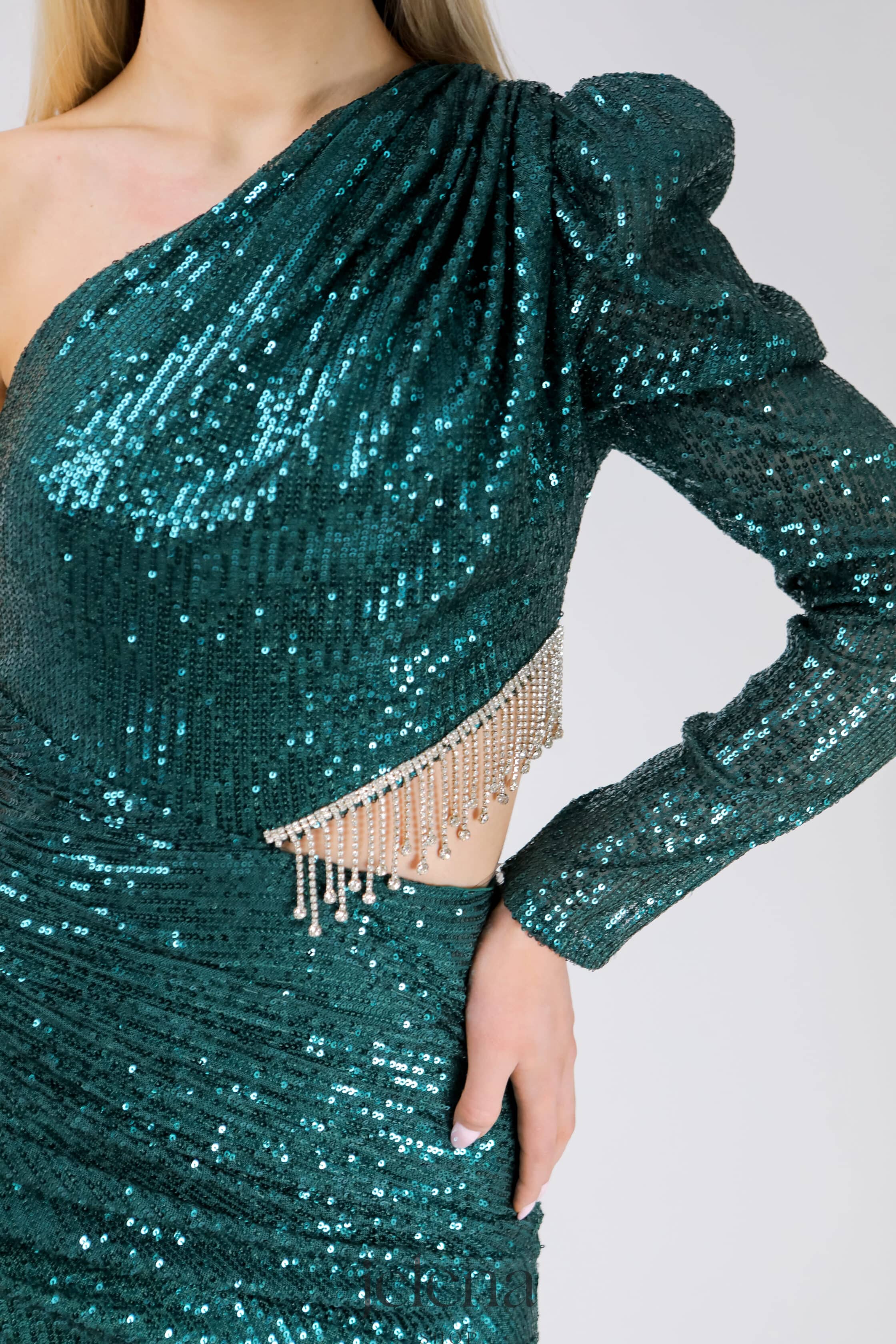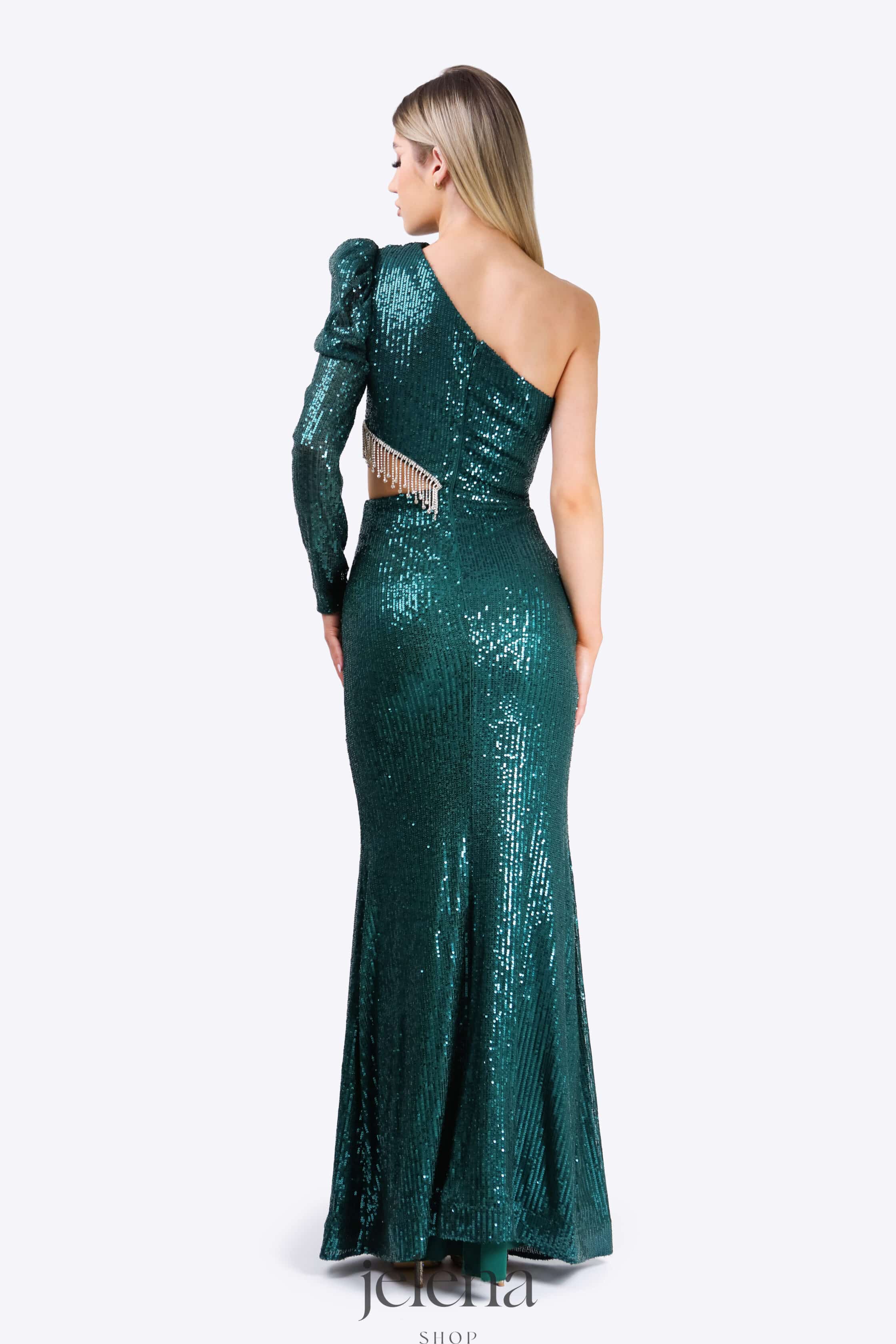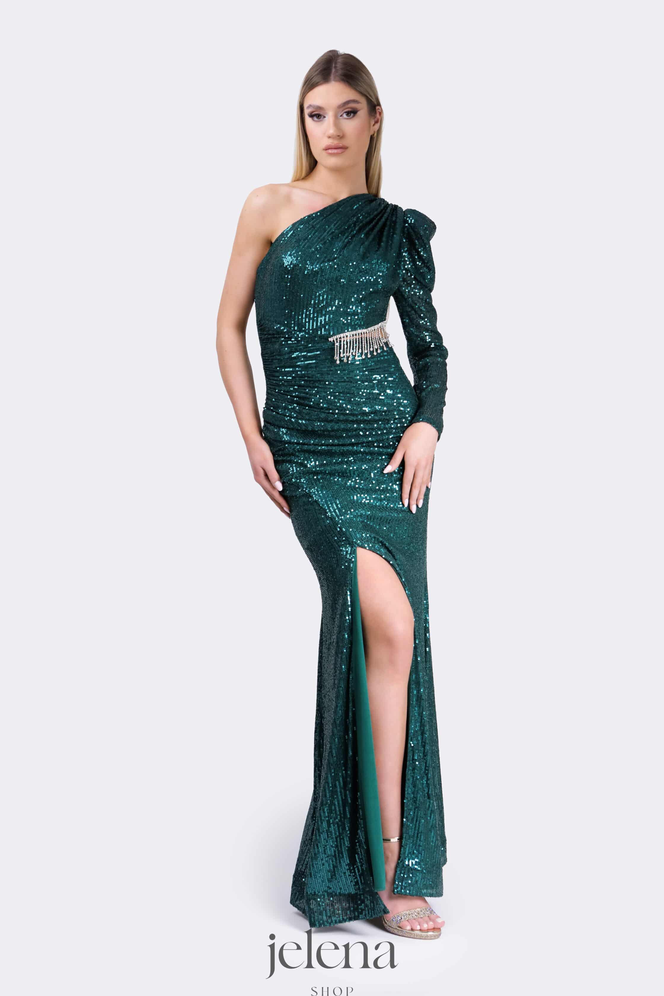 Ova glamurozna haljina prati liniju tijela i izrađena je od svjetlucavog materijala koji pruža luksuzan izgled. Asimetričan dizajn sa jednim rukavom i dekorativnim detaljem u struku naglašava siluetu, dok visoki prorez na nozi daje dozu senzualnosti i elegancije.