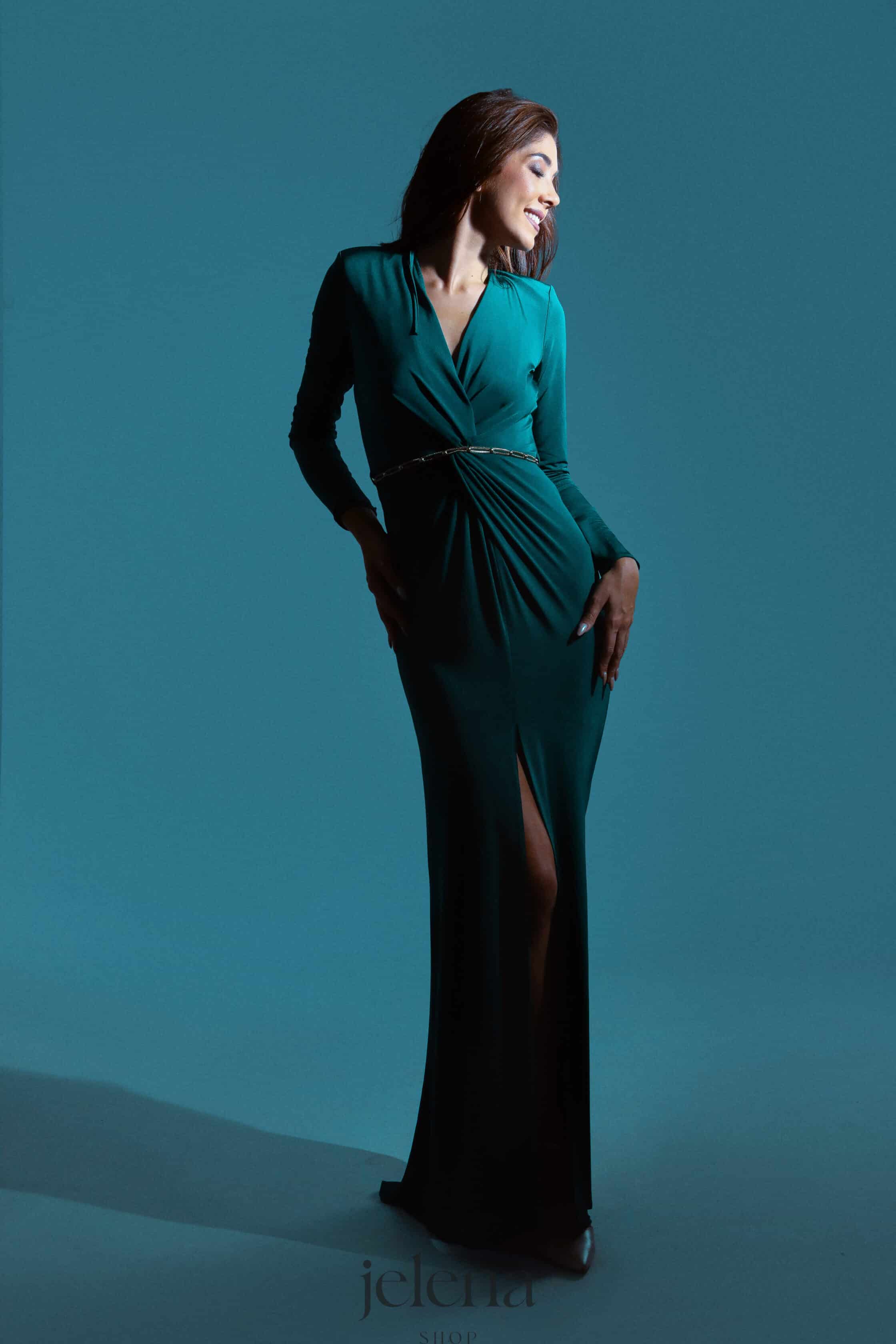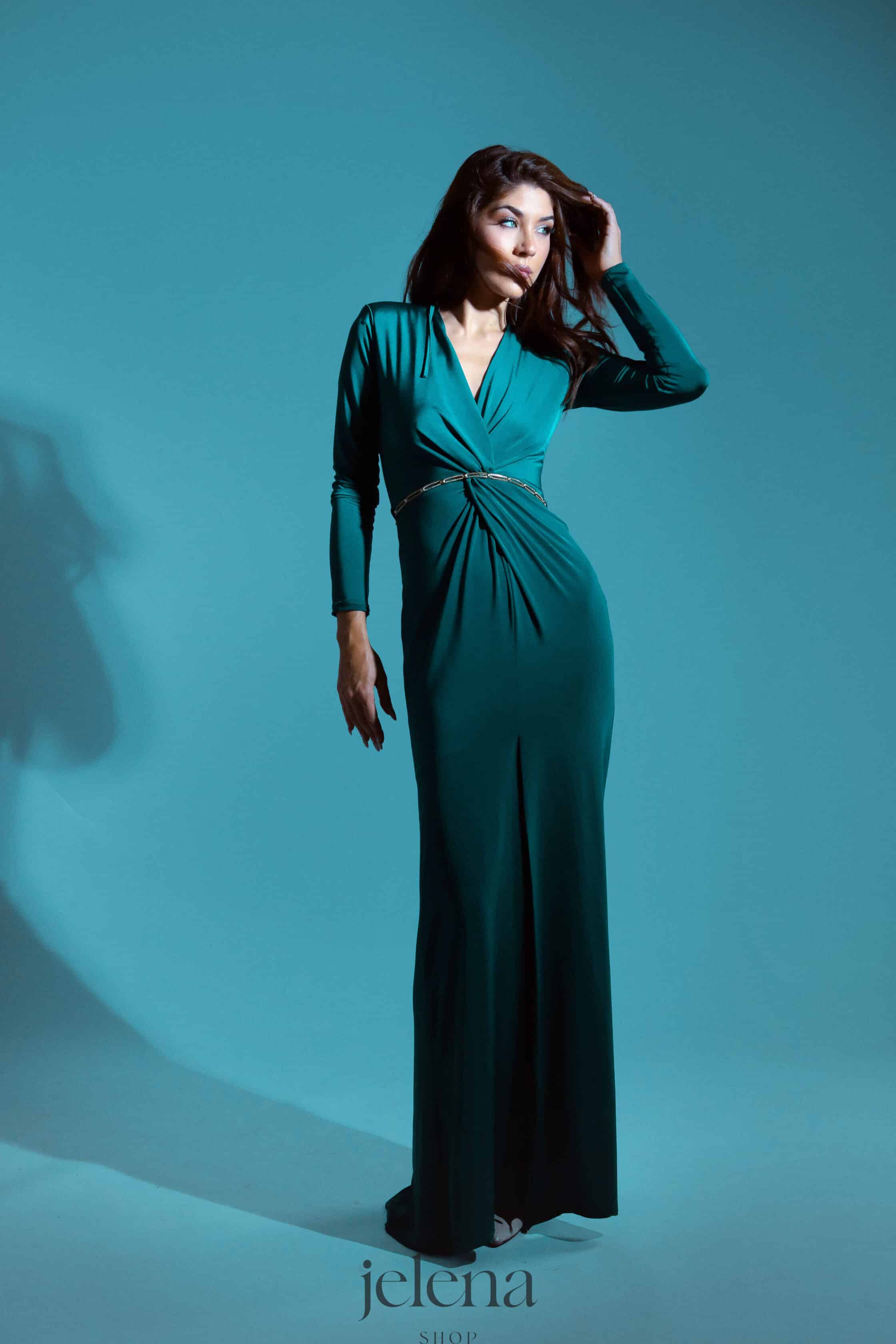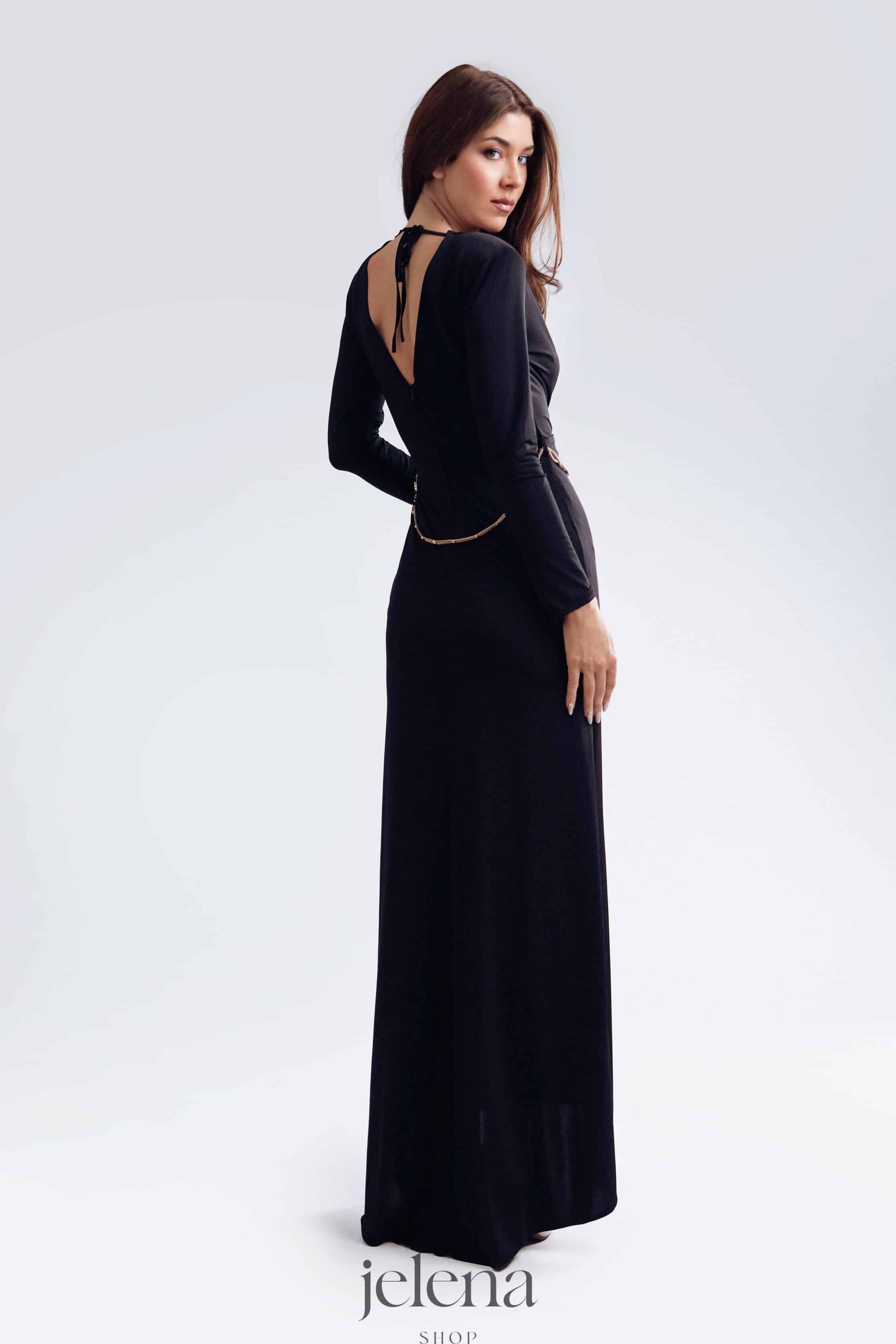 Elegantna duga haljina s dugim rukavima odiše sofisticiranošću i modernim glamourom. Prednji dio krasi efektan čvor u struku s decentnim zlatnim lancem koji naglašava figuru, dok visoki prorez dodaje dašak senzualnosti. Savršena za večernje izlaske, koktel zabave i posebne prilike.