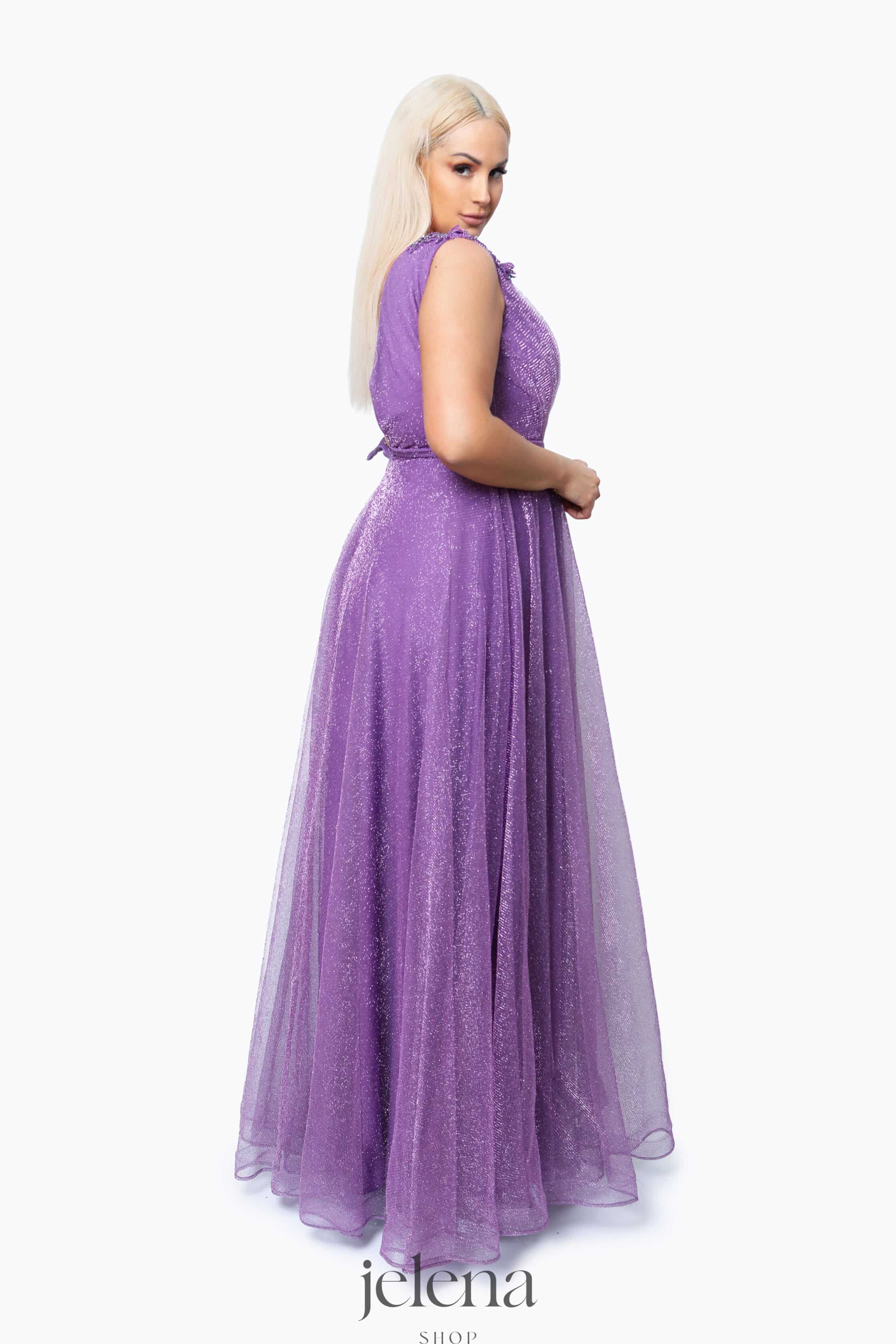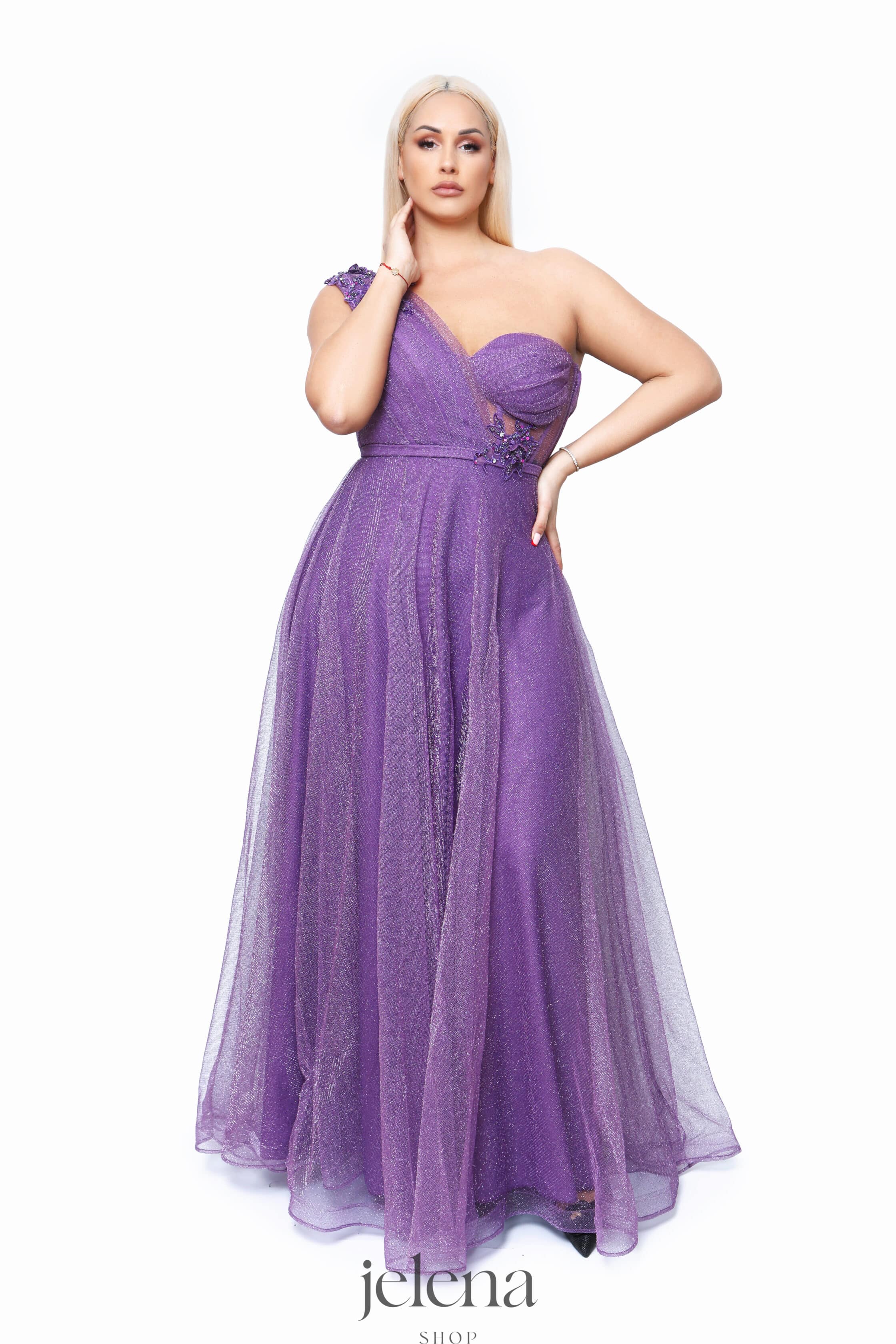Elegantna večernja haljina u raskošnoj ljubičastoj nijansi, izrađena od sjajnog, lagano lepršavog materijala koji pruža glamurozan izgled i profinjenu siluetu. Asimetrični gornji dio na jedno rame sa drapiranim detaljima i diskretnim ukrasom u struku naglašava ženstvenost, dok lepršava suknja omogućava udobnost i slobodu pokreta. Savršen izbor za maturske večeri, svečane događaje i posebne prilike kada želite ostaviti snažan i elegantan utisak.