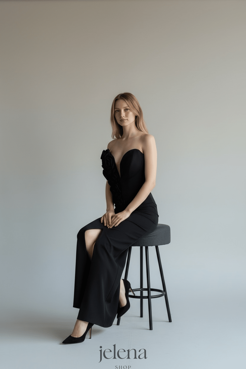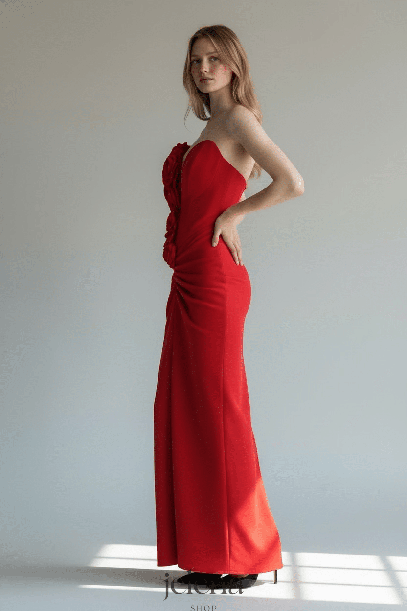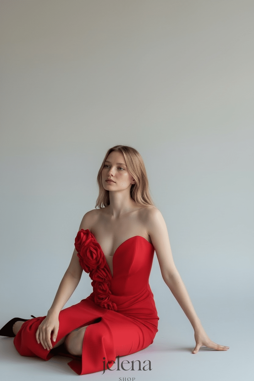 Ekskluzivna haljina upečatljivog dizajna dostupna u crnoj i crvenoj boji, stvorena za posebne prilike. Gornji dio bez bretela sa elegantnim izrezom naglašava dekolte, dok bogat dekor u vidu ruža daje luksuzan i jedinstven izgled. Drapirani detalji u predjelu struka savršeno oblikuju siluetu i dodatno ističu figuru. Izrađena od kvalitetnog i divnog materijala koji lijepo pada i pruža osjećaj elegancije i udobnosti.